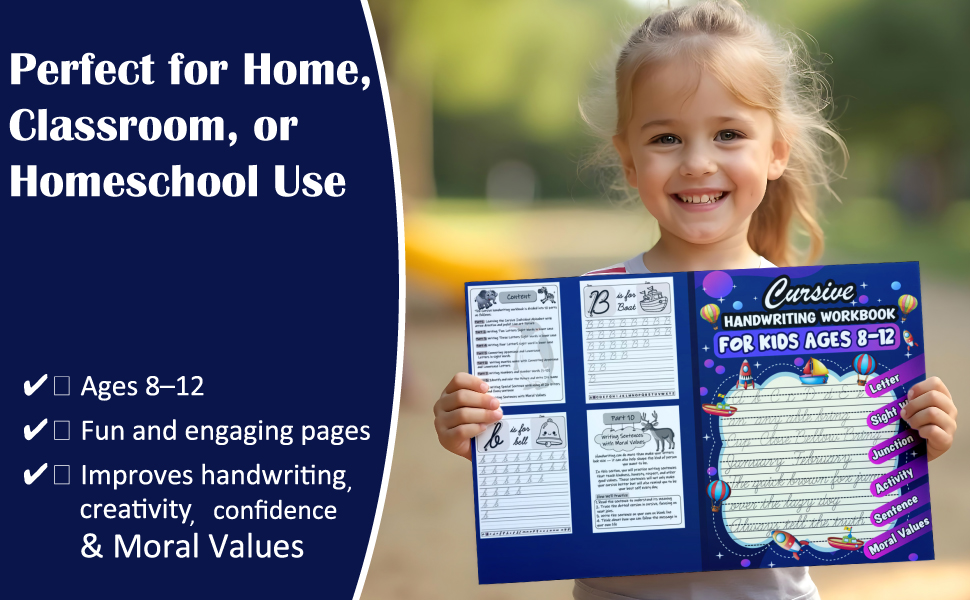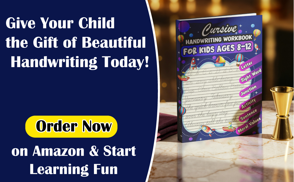This workbook especially made for kids ages 8-12 years to learn step by step Cursive writing with lots of pages for practice. This Book helps kids to build confidence, write neatly, and enjoy learning Cursive Fun and perfect for both home learning and your kids classroom practices